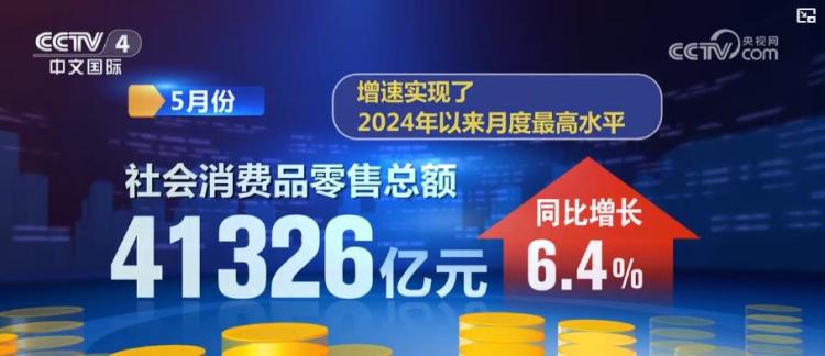 最新统计数据显示,5月份,社会消费品零售总额41326亿元,同比增长6.4%,增速实现了2024年以来月度最高水平。限额以上单位中,近九成商品类别零售额实现增长。消费市场回升向好的背后,新的增长点不断涌现。